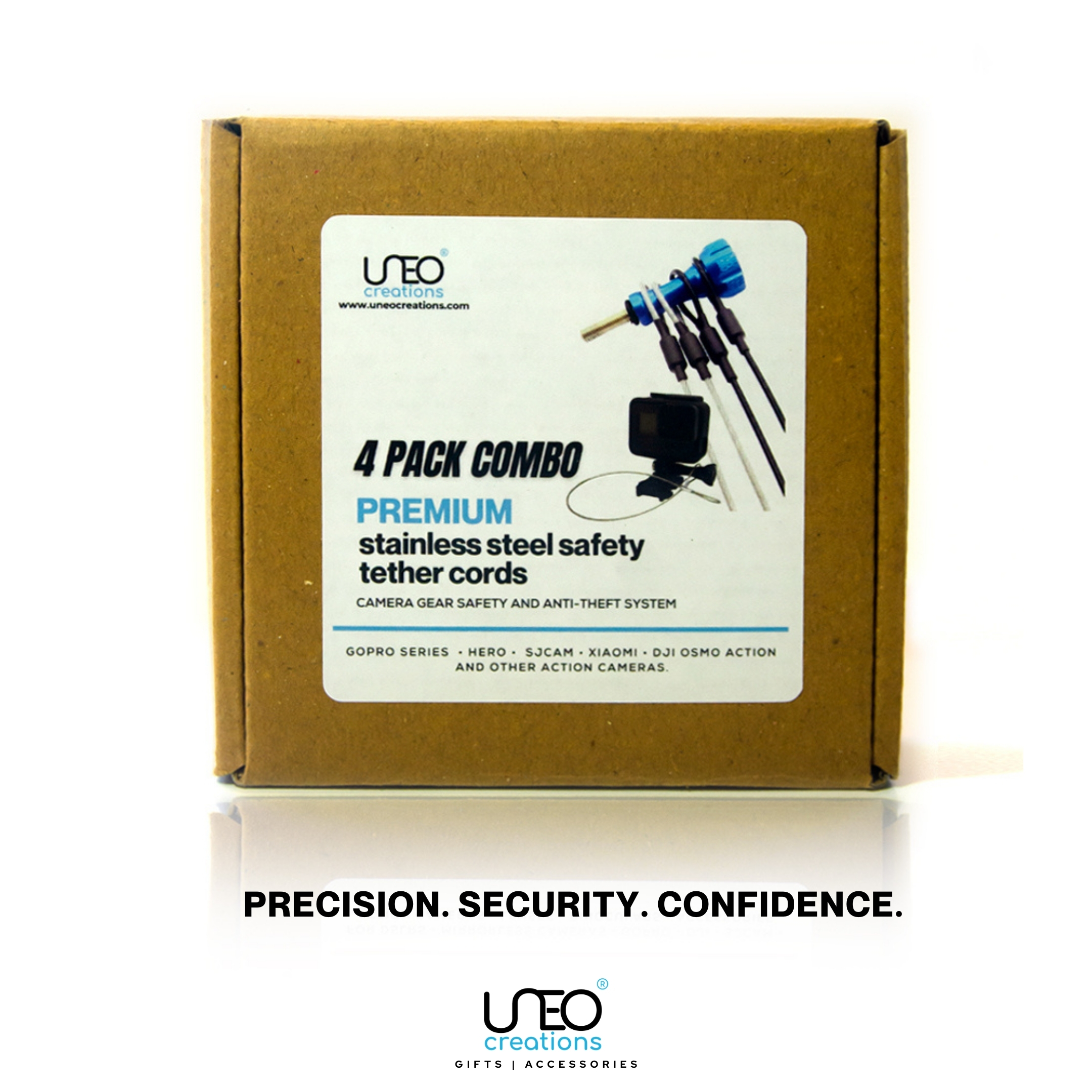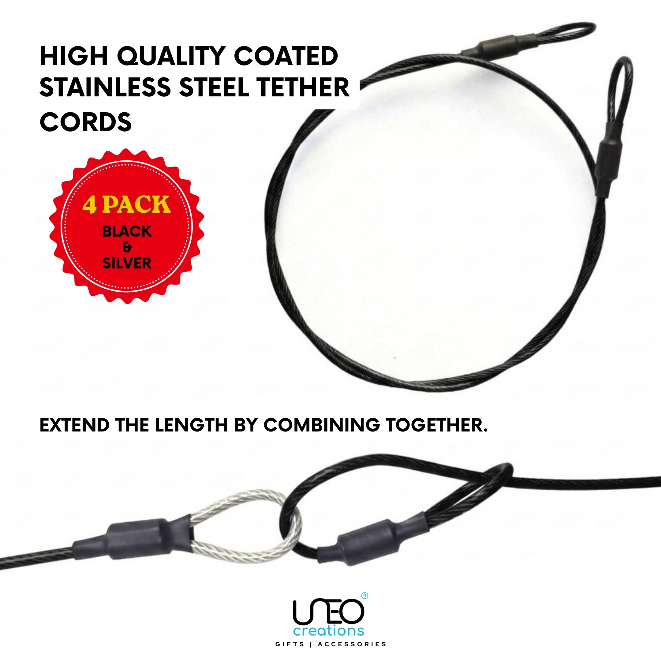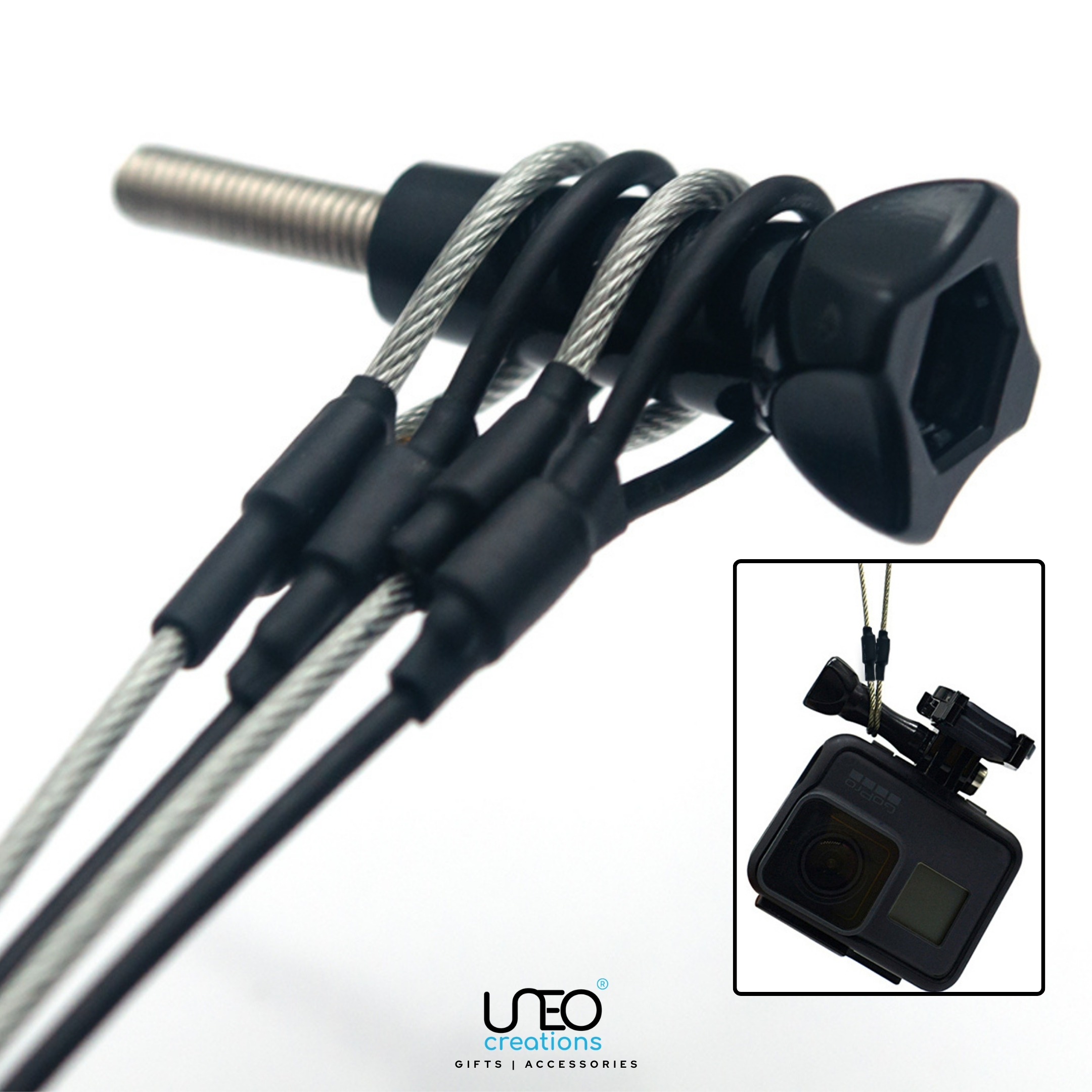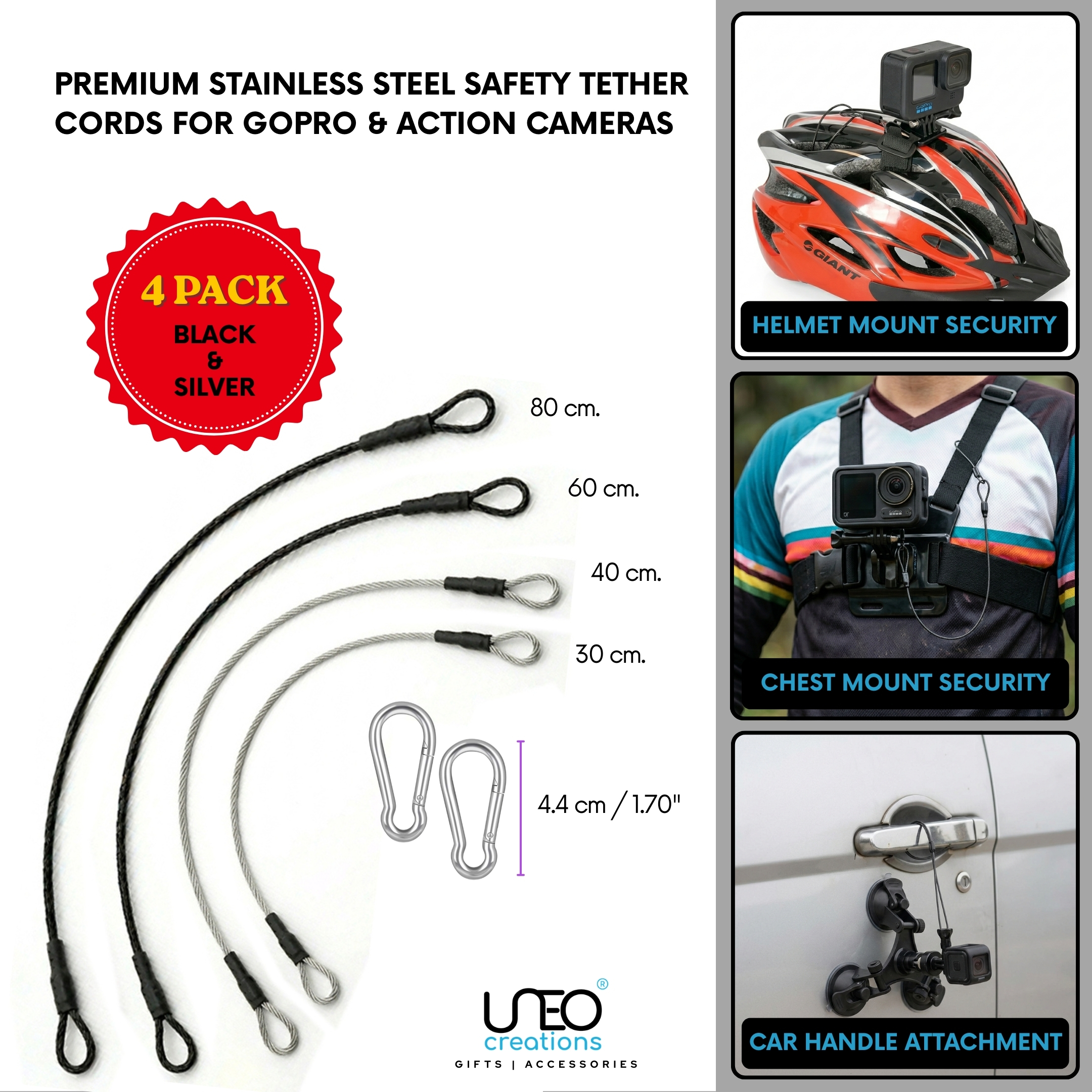This 4-piece tether kit includes four different lengths — 30cm, 40cm, 60cm and 80cm — so you always have the right safety cord for any mounting setup.