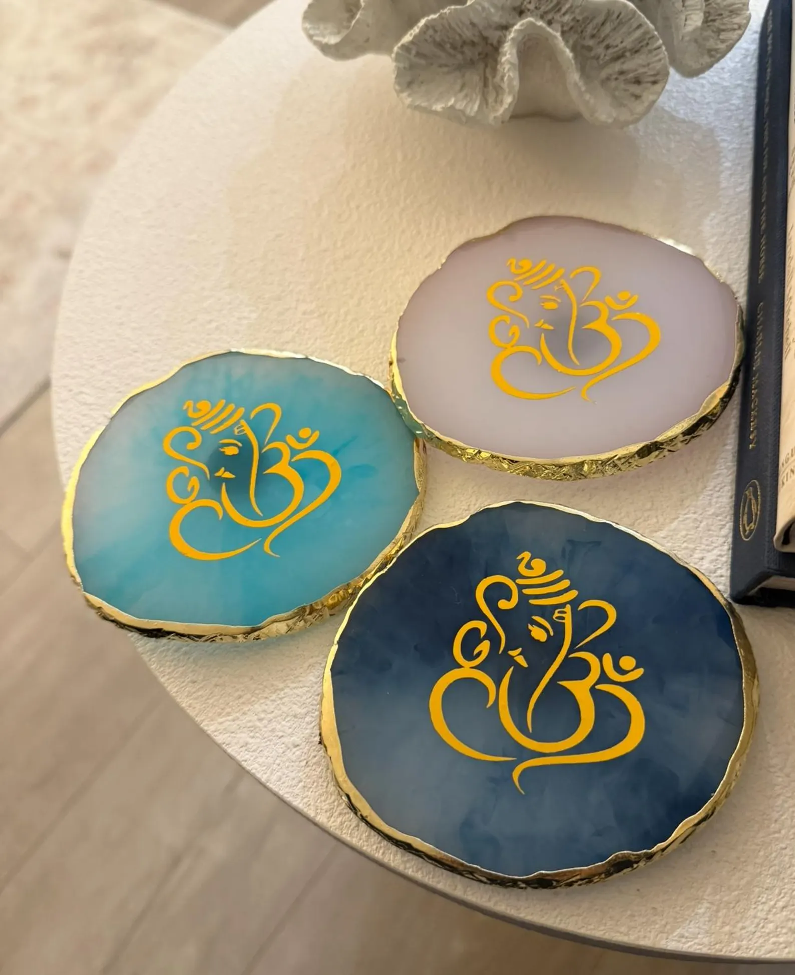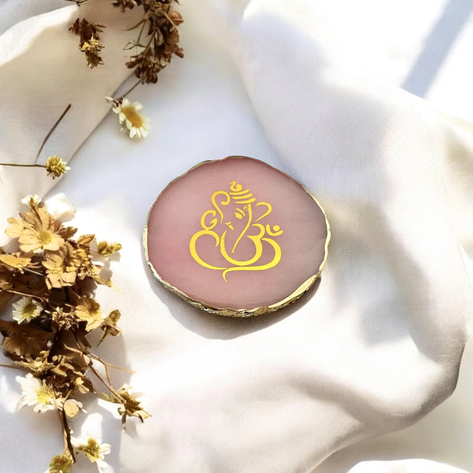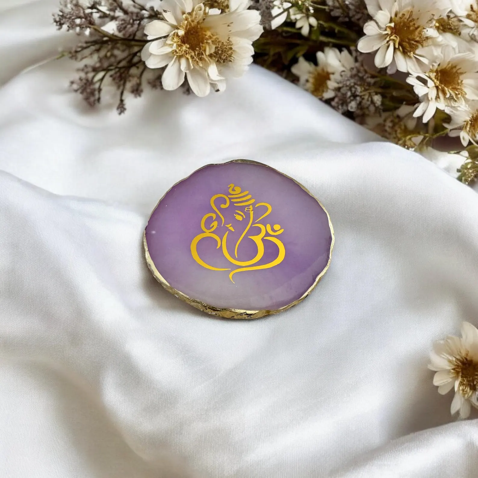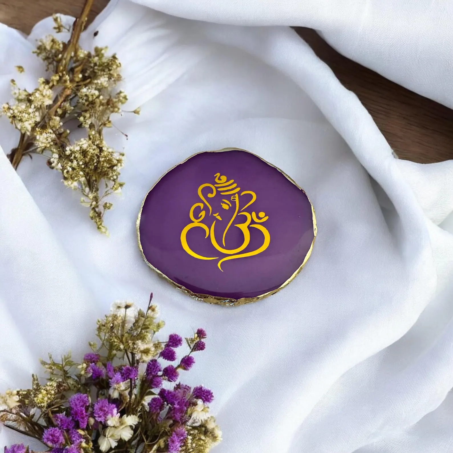 Bring elegance and spirituality to your celebrations with our custom Ganesh (Ganesha) agate slices. Featuring a beautiful gold design on a resin agate slice, these pieces make perfect home accents, meaningful gifts, or unique favors for special occasions. Each slice can be crafted with or without a magnet on the back, allowing versatile display on any surface. Available in pink, red, green, blue, white, and purple, these handcrafted creations add a divine and graceful touch to every celebration.