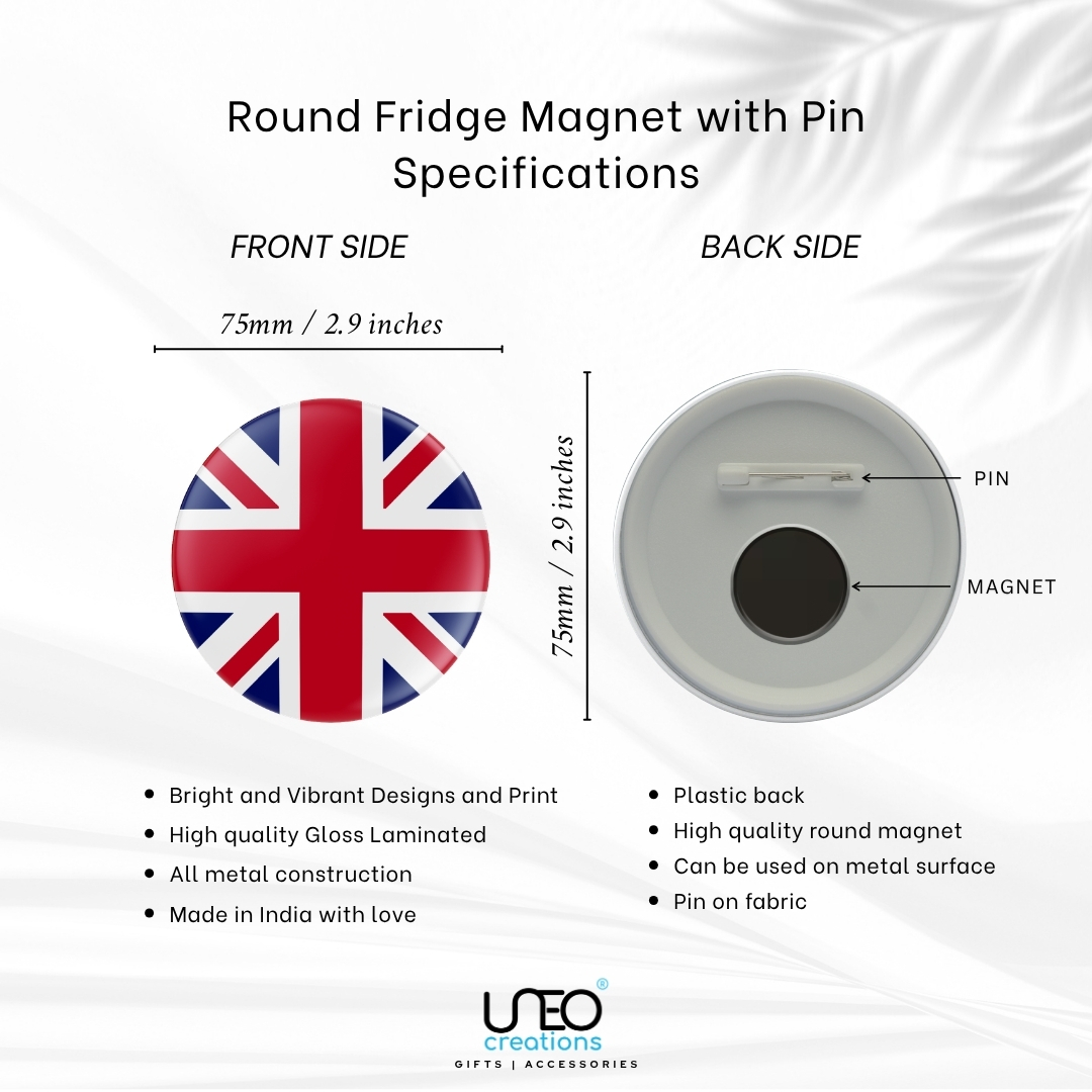 • 75mm Pin Badge with Fridge Magnet (Dual Use): Each badge can be worn using the pin or displayed as a fridge magnet on metal surfaces.