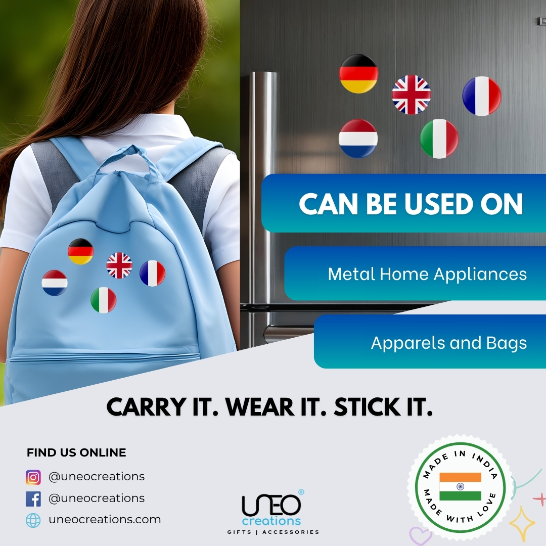 • Strong Magnet & Secure Pin Backing: Designed for firm grip on refrigerators and safe attachment on clothing, bags, or backpacks.